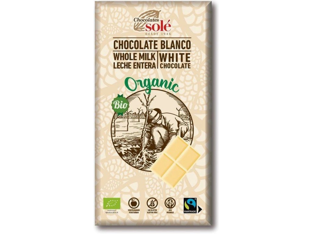 Jemná bílá čokoláda slazená přírodním třtinovým cukrem z Brazílie. Ovoněná je čistou vanilkou a jako emulgátor je použitý lecitin z bio slunečnic. Bio čokolády značky SOLÉ na sobě nesou logo FAIR TRADE. Fair trade - spravedlivý obchod - garantuje farmářům z rozvojových zemí spravedlivou odměnu a zakazuje otrockou a dětskou práci.