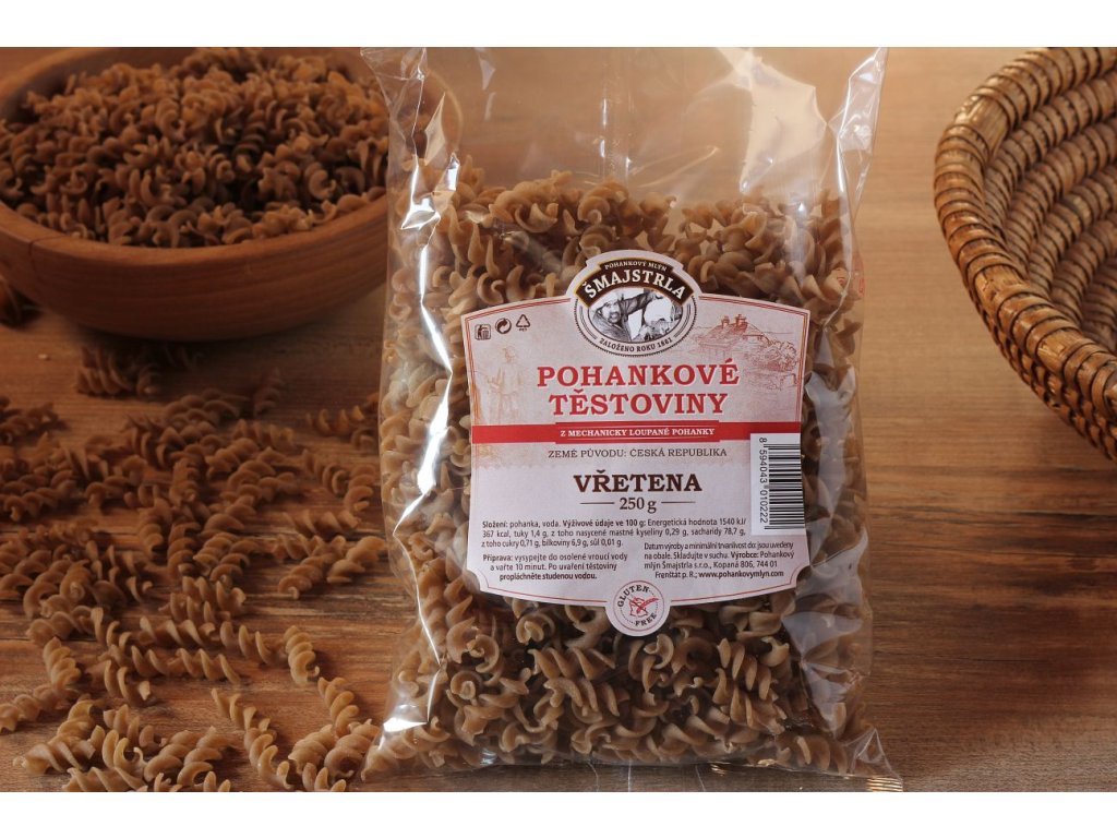 Pohankové těstoviny VŘETENATěstoviny vyrábíme pouze z naší pohankové mouky. Jsou bezvaječné a bez přídavků jiných surovin a hlavně... žádná chemie!